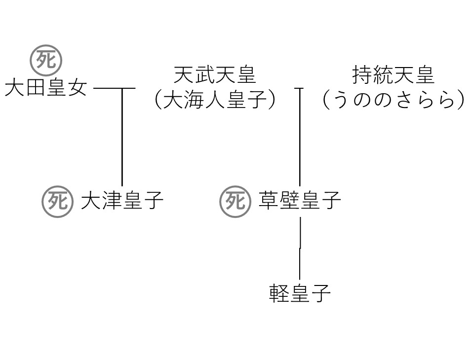 また、天武天皇には、次の天皇の候補として二人の息子がいました。一人は後のうののさらら(後の持統天皇)を母とする、草壁皇子(くさかべのおうじ)。もう一人は、優秀だったけど選ばれなかった、大津皇子(おおつおうじ)です。
